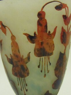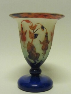 Farbloses Glas mit ein- und aufgeschmolzenem Pulver in Weiß, Blau, Orange und Rot. Umlaufend geätzter Dekor: Fuchsien. Binnenzeichnung in Nadelätzung.
