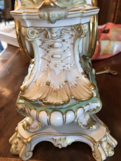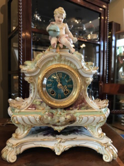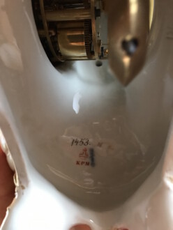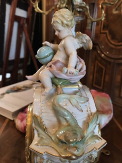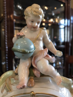 Sehr schönen kleines Uhrengehäuse auf Postament 1914, oben eine Figur ( Puttchen ) – Erstausformung 1891, nach einer Skizze von Schley, modelliert von Seifert und Albrecht – Modell-Nr. 3598, je Zepter in Unterglasurblau, je Reichsapfel über KPM in Aufglasurrot – Uhrwerk Lenzkirch – Weichmalerei, Aufglasurmalerei, Aufglasurfonds, Goldstaffage – Höhe 29,5 cm, mit Postament 32,5 cm, Breite Sockel 25 cm, Tiefe 16 cm