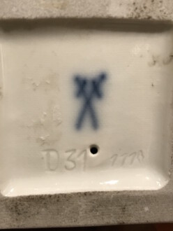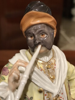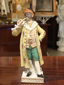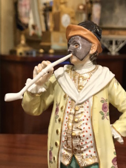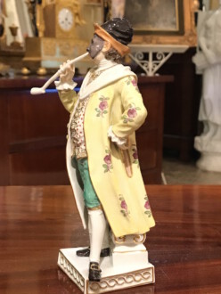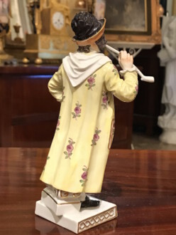 Cortesan – Figur eines Komödianten aus der Commedia dell‘ Arte – stehend eine Pfeife rauchend, das Gesicht von einer Maske bedeckt, mit schwarzem orange gefüttertem Hut, gelber Mantel mit Blumenbemalung und grüner Kniebundhose, auf einem viereckigen Sockel mit Wellenbandrelief in Gold, Unterglasurblaue Schwestermarke ca. 1934 – 1948, Modellnummer eigepresst D31, weitere Pressnummern, Höhe: 17 cm