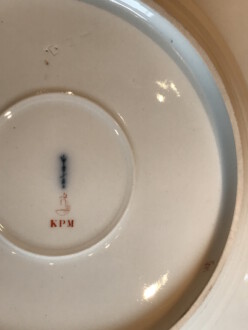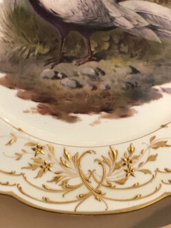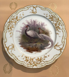 flacher Teller Augusta Tafelservice – Reliefgold und Goldstaffage – Die Spiegeldarstellung des Ziertellers zeigt ein Silberfasanpärchen – Reichsapfel über KPM in Aufglasurrot – Zepter in Uglbl. – Durchmesser 25 cm – Jugendstil 1910