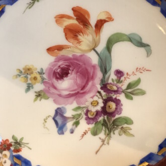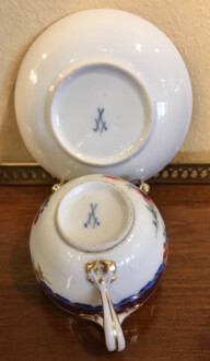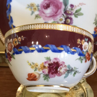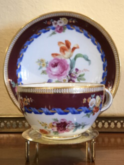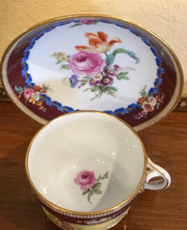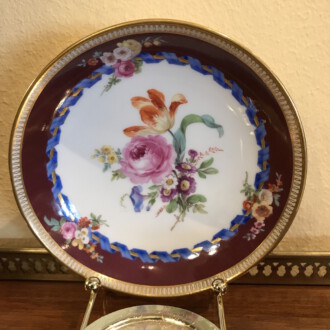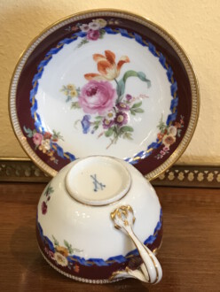 Tasse mit Untertasse – Meissen ca. 1820 – bunte Bukettmalerei in der Mitte, kleine Buketts seitlich, deutsche Blume, brauner Rand mit blauem Band ringsum – Tasse: Durchmesser 7,5 cm Höhe: 5 cm – Untertasse: Durchmesser 13 cm Höhe 3 cm