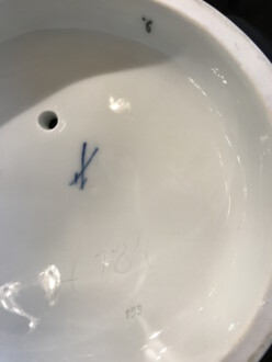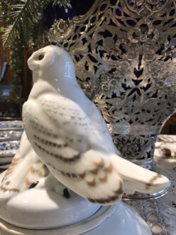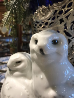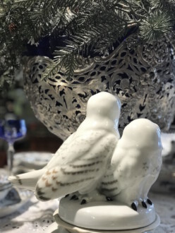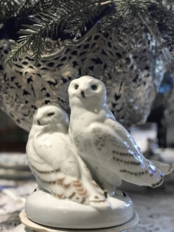 Schnee-Eulenpaar – Modell von Hermann Fritz – Meissen nach 1934 ( Modell 1908 ) – Höhe: 19,5 cm – polychrome Malerei – Unterglasurblaue Schwertermarke, Pressnummer, Modelnr. X 184 – über einem Rundsockel zwei aneinander sitzende Schnee-Eulen – 1. Wahl