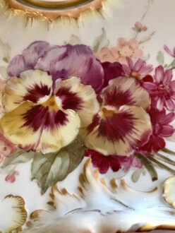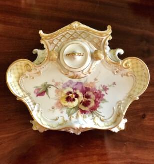KPM Tintenfässchen mit Untersatz – Stiefmütterchen in stimmiger Weichmalerei – Fässchen beidseitig mit Blüten dekoriert – Untersatz mit goldenen Gitternetzlinien und hellgelben Fonds dekoriert – Höhe: 10 cm, Länge: 21,5 cm, Breite: 18 cm – Jahresbuchstabe N für 1914