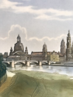 Blick vom rechten Elbufer unterhalb der Augustusbrücke – auch „Canaletto-Blick“ genannt – nach dem Ölgemälde des Canaletto genannten Malers Bernardo Bellotto, das dieser 1748 in Dresden gemalt hat. Rechts, am jenseitigen Ufer, die katholische Hofkirche, die Brücke, die Kuppel der Frauenkirche – Durchmesser: 25,3 cm – Pfeifferzeit 1924 – 1934 – I. Wahl – in der unteren Fahne eingeprägtes Wappen von Dresden, in der oberen Fahne Wortlaut Dresden