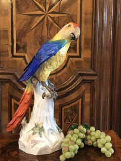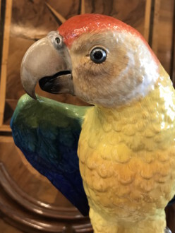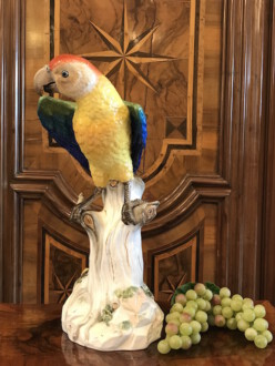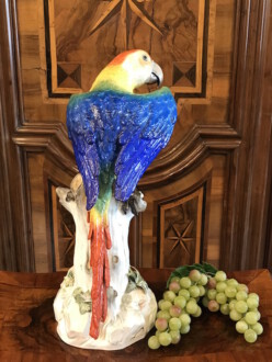 große Tierfigur Meissen – farbenprächtiger Papagei Ara auf hohem Stamm – naturgetreu modelliert und staffiert – Entwurf von Johann Joachim Kaendler 1763 – Formnummer: A 43 – Höhe: 43 cm – ca. 1880 – Blätter leicht bestoßen