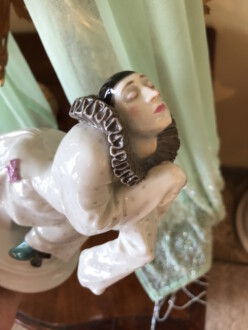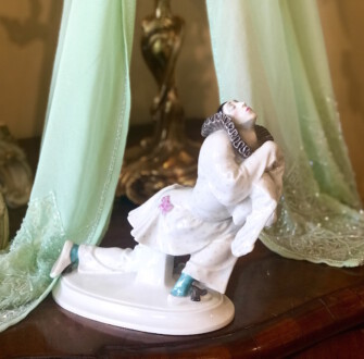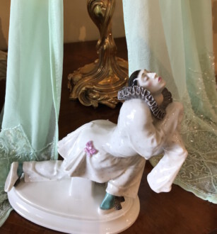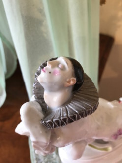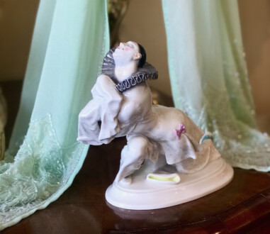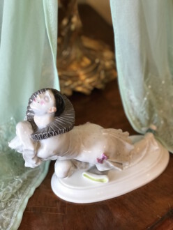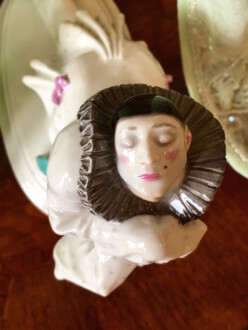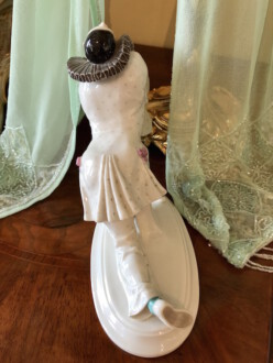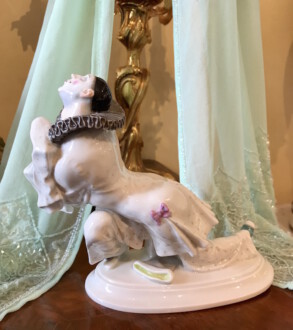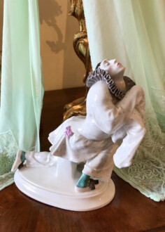 Meissen – Figur – Pierrot – Entwurf: Paul Scheurich – Figur aus dem sog. Russischen Balett – farbige Bemalung – knieender Pierrot mit beschwörend erhobenen Händen auf ovalem flachem Sockel – Höhe: 18 cm – Firmenmarke (ugl.-blaue Schwertermarke), geritzte Mod.Nr. D.283. – nach 1934