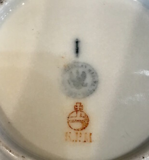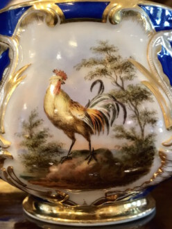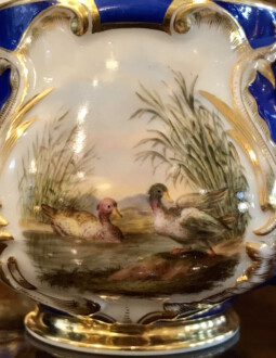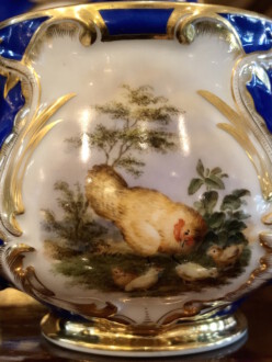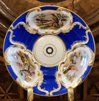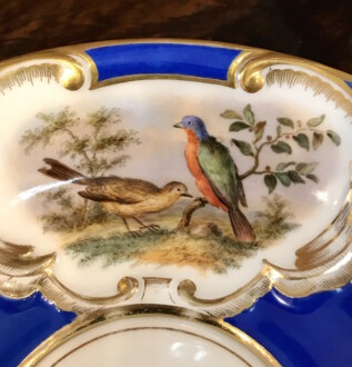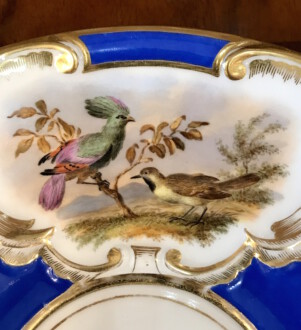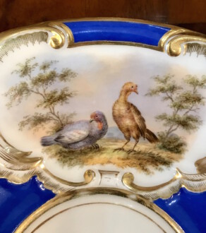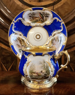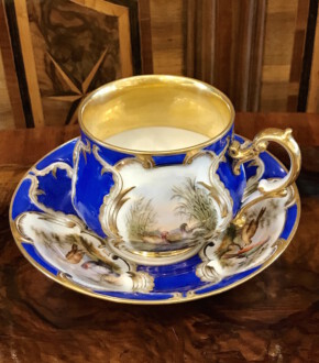 Opulente Tasse mit Untertasse der KPM Berlin – (1849 – 1870) – Biedermeierform – Tasse und Untertasse in preußisch blauem Fond mit je drei Kartuschen, versehen mit polychromer Vogel- und Hühnermalerei – Tasse mit breiten Innengoldrand und vergoldetem Ohrenhenkel – Kartuschen mit profilierter vergoldeter Umrahmung – Tasse: Höhe 8 cm, Untertasse: Durchmesser 16 cm