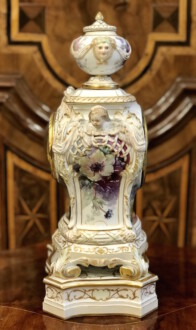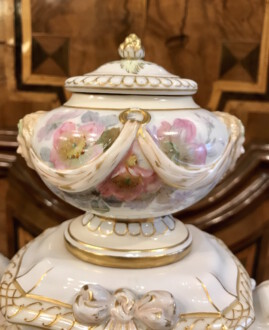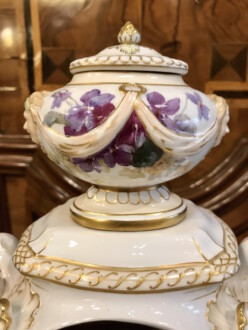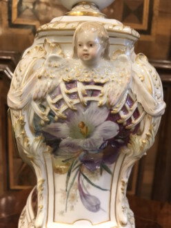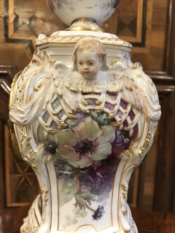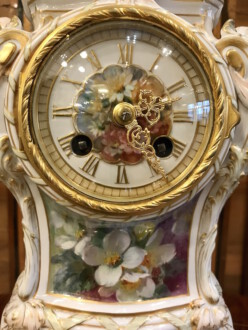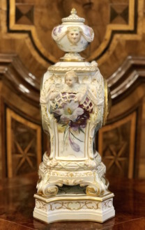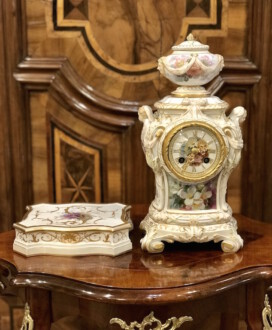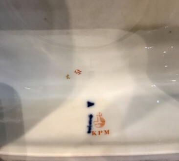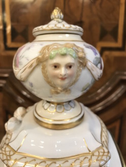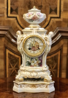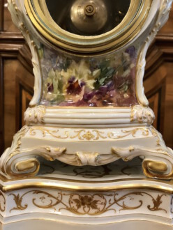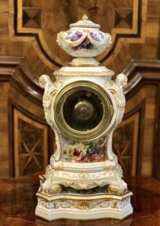 Porzellanuhr auf Postament – gefertigt in der Manufaktur KPM Berlin – farbig und gold staffiert – über rechteckigem Sockel Uhrengehäuse auf vier Volutenfüßen mit feiner Weichmalerei, seitlichen Puttenköpfen und bekrönender Deckelvase mit Maskarons und Tuchdrapperie – Zetpermarke und roter Reichsapfel – Jahreszeichen S für 1918 – Uhrwerk Lenzkirch – Höhe mit Sockel 39cm