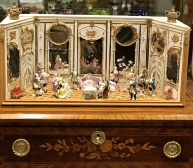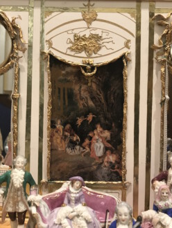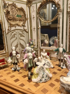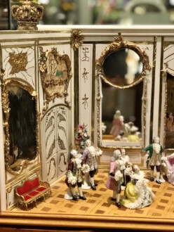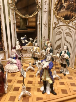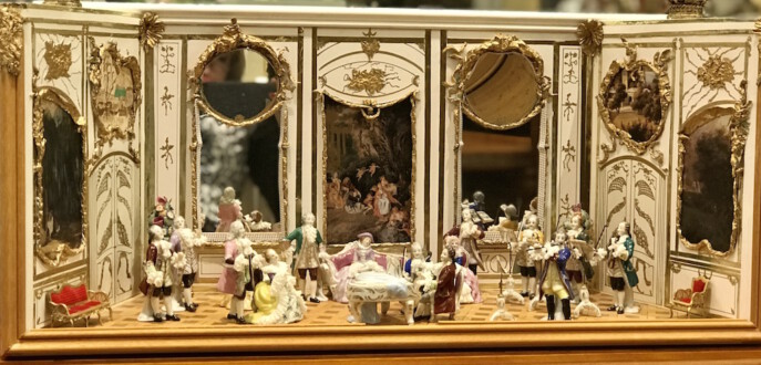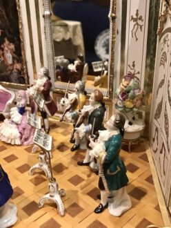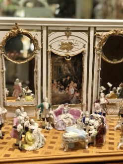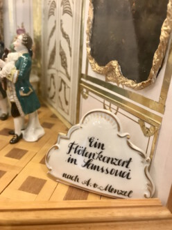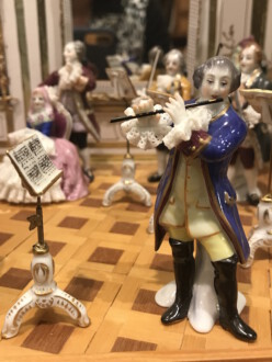 Originell und Original: 1852 malte Adolph Menzel sein berühmtes Bild ,, Das Flötenkonzert in Sanssouci ,, Die Modulation der musikalischen Soiree in Porzellan wurde angefertigt von der thüringischen Porzellanmanufaktur Älteste Volksstedt, zwölf Figuren, Klavier und Notenständer. So sind alle um Friedrich den Großen versammelt. Seine Lieblingsschwester Wilhelmine, zu deren Ehren das Konzert stattfand und die es sich in weit ausladendem Kleid auf dem Sofa bequem macht, ist ebenso vertreten wie die kluge Prinzessin Anna Amalie. Weitere Anwesende sind Carl Philipp Emanuel Bach, Franz Benda, Gräfin Sophie Caroline von Camas, Isak Francais Egmont von Chasot, Wilhelmine Markgräfin von Bayreuth, Graf Gustav Adolf von Gotter, Jacob Friedrich Bielfeld, Carl Friedrich Grau, Pierre Louis Moreau deMaupertuis, sowie Kammermusiker und Hofdamen . Fast möchte man erneut die heiteren Flötentöne durch den Saal schallen hören. Sogar die Noten sind zu erkennen. Sorgloses Rokoko also, wie es leibt und musiziert, in den kunstvollen Figuren dreidimensional wieder auferstanden. Der Kammermusik-Salon wurde in liebevoller Handarbeit angefertigt. Breite: 62 cm, Tiefe. 22 cm, Höhe: 29 cm