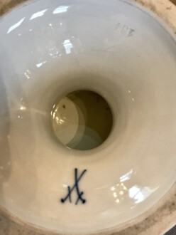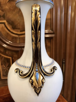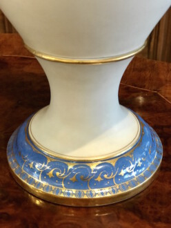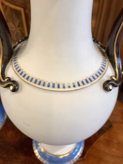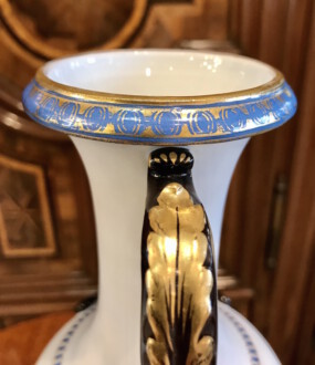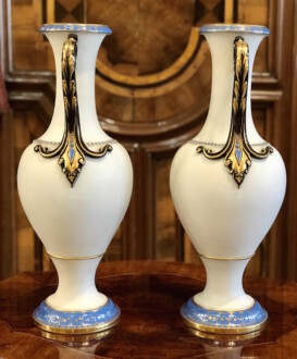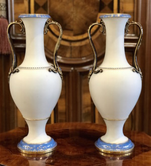 Vasenpaar der Manufaktur Meissen – elegante Form – Korpus Bisquitporzellan – Standfuß und oberer Vasenabschluß mit hellblauem Rand, glasiert und umlaufender Goldmalerei – Henkel dunkelbraun glasiert mit Gold und hellblau staffiert – Formnummer F 134 – Unterglasur blaue geknaufte Schwerter, um 1900 – Höhe: 35 cm