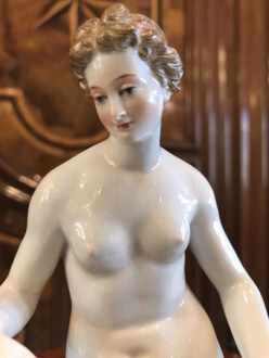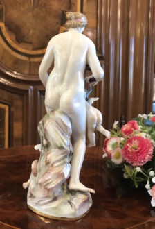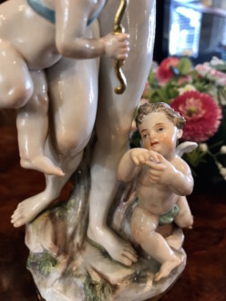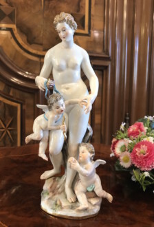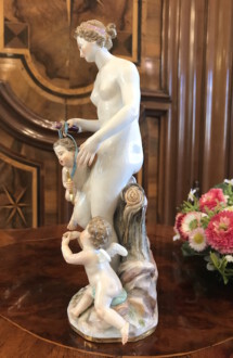 Darstellung: „Venus mit zwei Amoretten“ – Modell von Johann Joachim Kaendler – Venus, Göttin der Liebe und der Schönheit, aus dem Schaum des Meeres geboren, spendet Fruchtbarkeit und hat die Macht, alle Götter und Menschen verliebt zu machen – Formnummer A 65 – Malernummer 1 – Höhe: ca. 22cm – Knaufzeit um 1900 – Unterglasurblaue Schwertmarke von Meissen