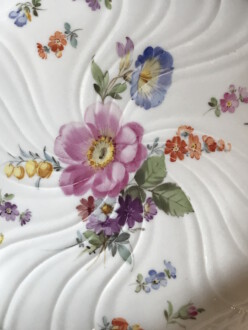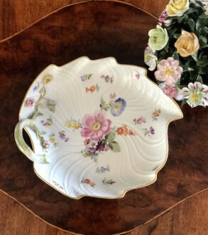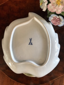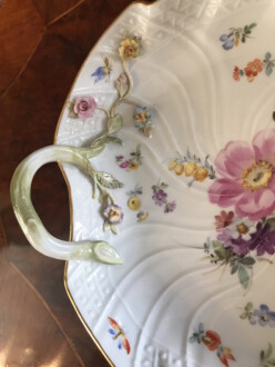 Blattschale mit Neubrandensteinrelief, Blumen- und Insektenmalerei typisch im Stil des 19. Jahrhunderts – als Henkel ein in die Schale verschlungener Ast an den Enden mit plastisch modellierten Blüten und Blättern – Länge: 19cm Breite: 16,5 cm – Unterglasurblaue geknaufte Schwertmarke Meissen