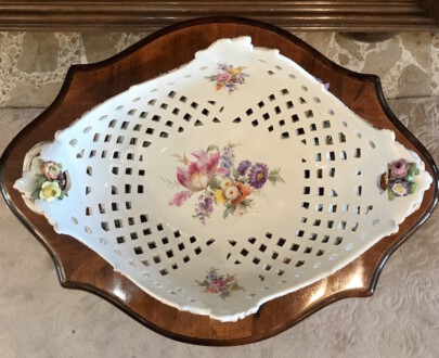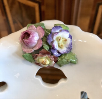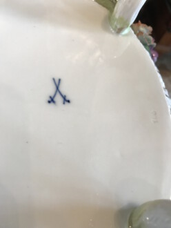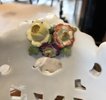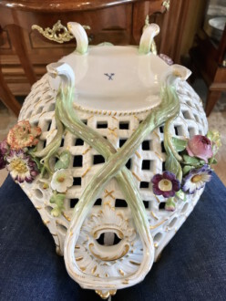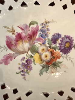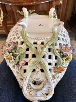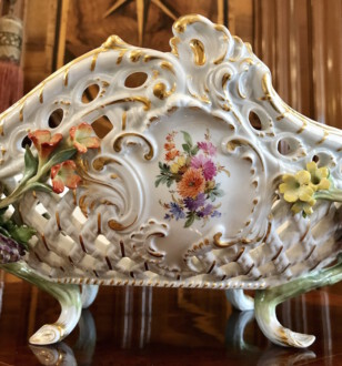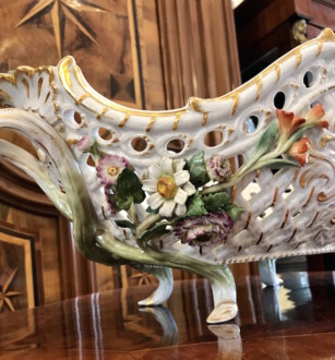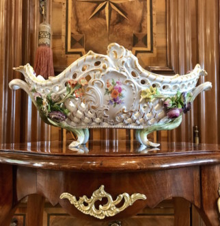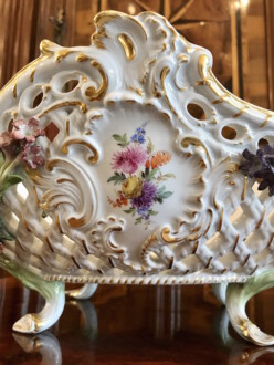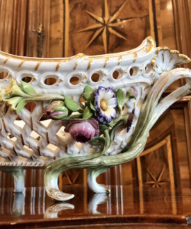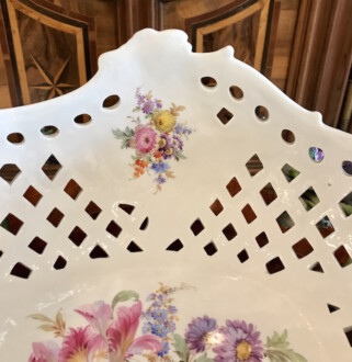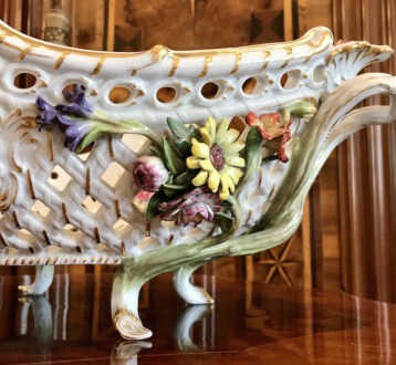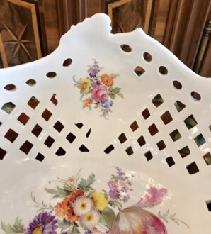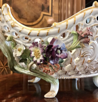 ovaler Korb auf vier grün staffierten Astfüßen aus denen seitlich zwei Henkel mit bunten Blumenzweigen wachsen – belegt mit plastisch dargestellten Blüten und Blättern – durchbrochen gearbeiteter Korpus – Henkel und Füße ineinander verschlungen – mittig bemalt mit einem schönem Blumenbukett – in der Mitte der Längsseiten zwei Rocailleschilder mit bunten Manierblumen – an den Griffseiten innen aufgesetzte plastische Blüten und Blätter – Unterglasurblaue Schwertermarke, Meissen I. Wahl, Knaufschwerter ca. 1880 – Länge: 44 cm, Breite: 28 cm, Höhe: 17cm