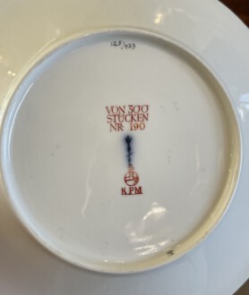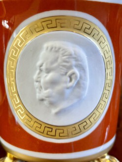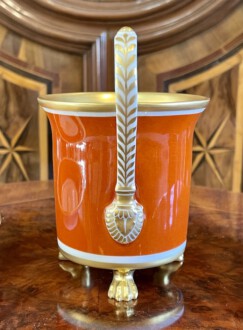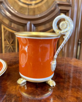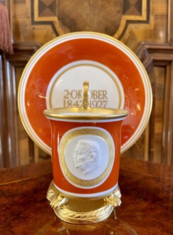 Jubiläumstasse zum 80. Geburtstag von Paul Hindenburg ( 2. Oktober 1847-1934 ) – Tasse mit Untertasse der Porzellanmanufaktur KPM Berlin 1927 – Walzenform mit drei Tatzenfüssen und Volutenhenkel – Wandung mit rundem Bisquitrelief von Hindenburg – eingerahmt in Gold radiertem Mäanderkranz – rot/orange farbende Glasur mit Goldrändern