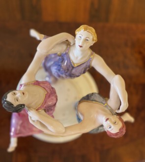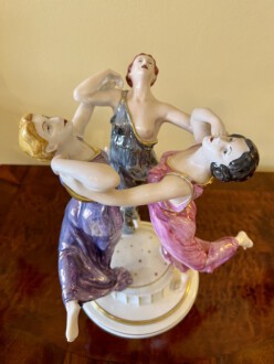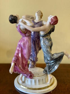 Figurengruppe ,,Festreigen,, der Porzellanmanufaktur Rosenthal, Selb – um 1920 – Entwurf Karl Himmelstoss im Jahre 1913 – drei tanzende Grazien in langen farbigen Gewändern ( Eosinglasur ) auf getrepptem, profiliertem und kanneliertem Rundsockel – Darstellung offensichtlich die drei Schwestern, Elsa, Berta und Grete Wiesenthal – alle drei bekannte Tänzerinnen und Tanzpädagoginnen – am Sockel signiert (geprägt) „K. Himmelstoss“ – Modellnr. K 210 – Höhe: 33 cm, Durchmesser: 26