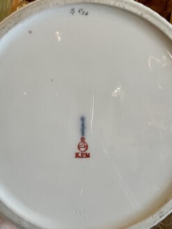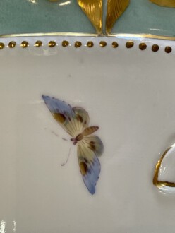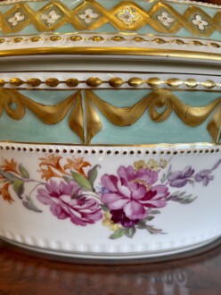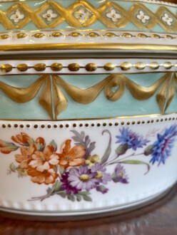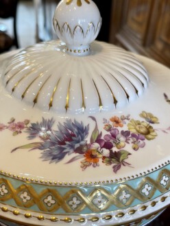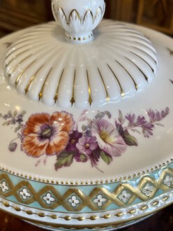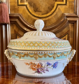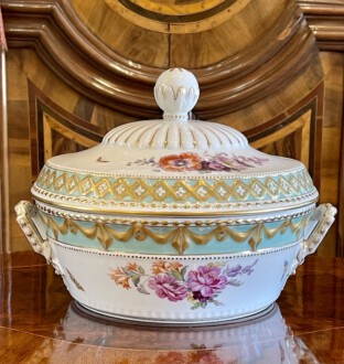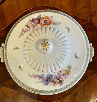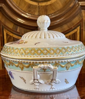Terrine der Porzellanmanufaktur KPM Berlin – Kurland Dekor 73 – reiche polychrome Blumenmalerei und Schmetterlinge auf Vor- und Rückseite – unterglasurblaue Zeptermarke und rote Reichsapfelmarke – Jahres- und Monatszeichen für Juli 1923 – Durchmesser:21,5 cm, Höhe: 18 cm, Fassungsvermögen: 1,5 Liter