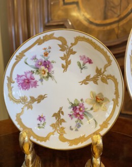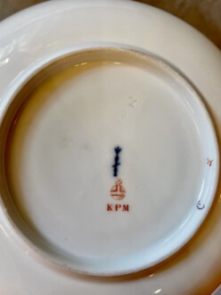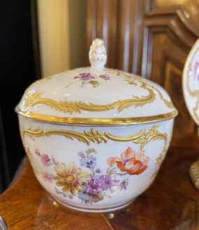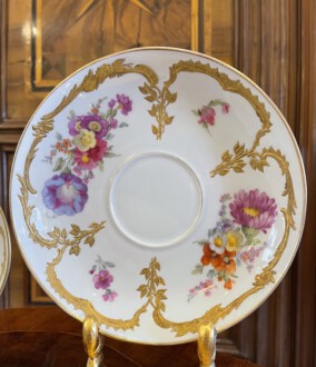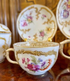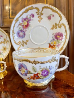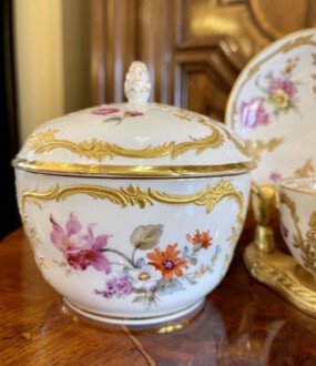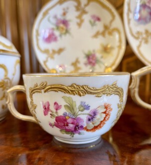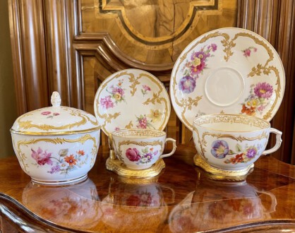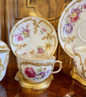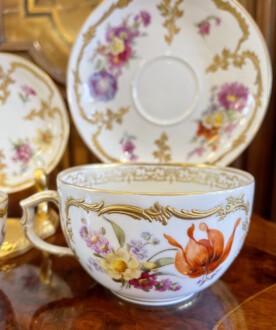 2 KPM Tassen mit Untertassen – Deckeldose – Neuzierat um 1900 – polychrome naturalistische Blumenmalerei partiell gerahmt von reichem erhabenen Reliefgold – unterglasurblaues Zepter, aufglasurroter Reichsapfel – Große Tasse: Höhe 7 cm, Durchmesser 11 cm, Untertasse: Durchmesser 18,5 cm – Teetasse: Höhe 5 cm, Durchmesser 8,2 cm, Untertasse Durchmesser 12,5 cm – Deckeldose: Höhe 12 cm, Durchmesser 12 cm