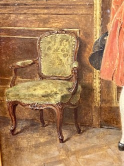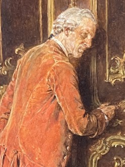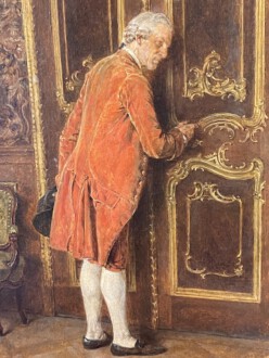 Rokokodiener in rotem Überrock an einer Tür klopfend – links unten signiert und datiert: C. Seiler 1920 – Carl Wilhelm Anton Seiler (geb. 3. August 1846 in Wiesbaden, gest. 26. Februar 1921 in München) – war ein deutscher Genremaler – Seiler malte im Stile der niederländischen Genremaler des 17. und 18. Jahrhunderts – auf Holz – Größe: 28,5 cm x 20 cm, mit Rahmen: 37 cm x 28,5 cm