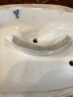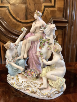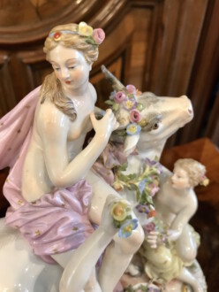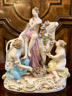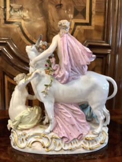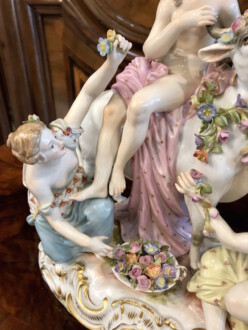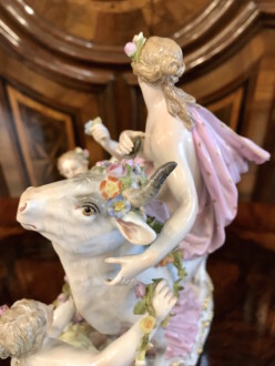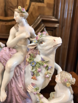 Sehr schöne Figurengruppe der Porzellanmanufaktur Meissen – Darstellung: die Europa auf dem Stier – farbig und gold staffiert – Modell von Johann Joachim Kaendler – unterglasurblaue Schwertermarke, Knaufzeit Ende 19. Jahrhundert – Modelnr. 2697 – Höhe: 22 cm, Breite: 20 cm – I. Wahl, manufakturbedingter Brandriss im Sockel