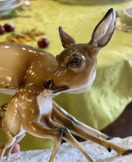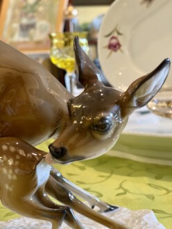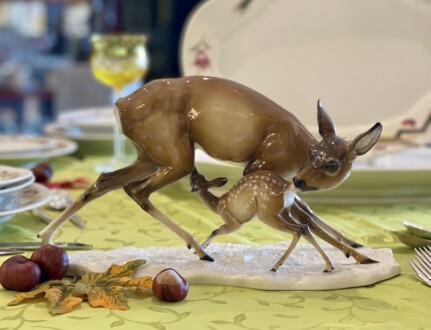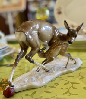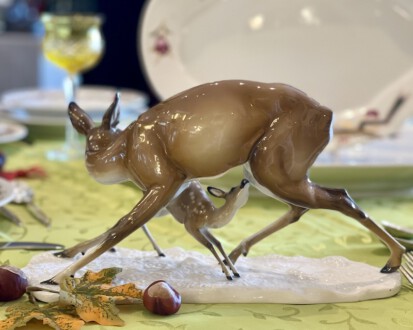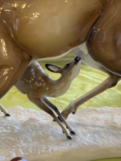 Figurengruppe Reh mit Kitz – Modell von A. Roehring für Rosenthal – auf naturalistischem Sockel Reh mit Kitz – feine, naturalistische Ausformung und Bemalung – unterhalb des Sockel Presssignatur, Modellnummer 895, grüne Bodenmarke aus dem Jahr 1941 in Reliefmarke – Erstausformung im Jahr 1926 – Länge: 31cm, Höhe:17,5 cm