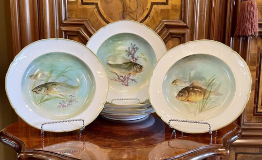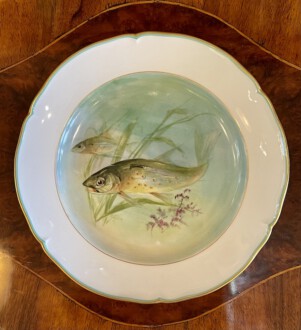 Satz von 6 Tellern – KPM Berlin – Englisch glatt, mit geschweifter Kante, zartem grün- und Goldrand – voll ausgemalter Fond mit Darstellungen von verschiedenen Fischarten – im Fond signiert – Durchmesser: 21 cm – unterglasurblaues Zepter, aufglasurroter Reichsapfel – Jahresbuchstabe B für 1902