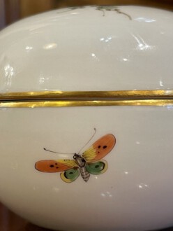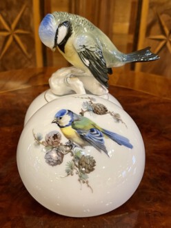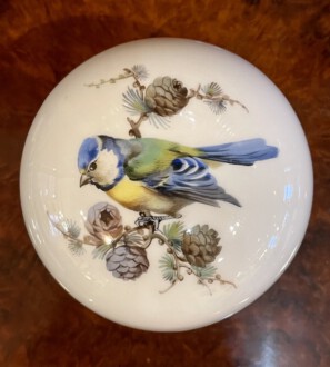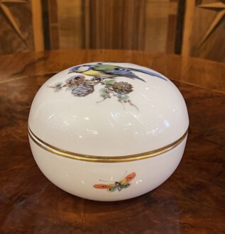 Deckeldose rund mit Vogelmotiv – Deckel polychrome Malerei, Blaumeise auf Lärchenast – Unterschale polychrome Malerei, Insekt und Schmetterlinge – Goldkante – Unterglasurblaue Schwertmarke Meissen – Meissen nach 1934 – Höhe: 7cm, Durchmesser: 9 cm