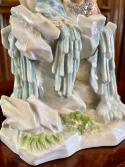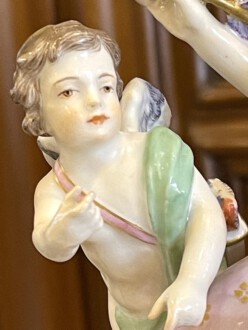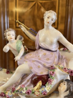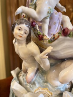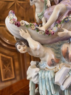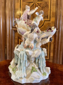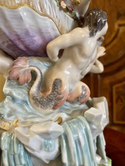 Bei der Figur „Venus in Meeresmuschel“ aus dem Jahr 1769 handelt es sich aller Wahrscheinlichkeit nach um eine Kaendler’sche Bearbeitung eines alten Modells aus der Zeit seines epochalen „Schwanenservice“. Zu sehen ist die Liebesgöttin Venus mit ihrem Sohn Amor in einer Muschel, die Kaendler im Stil des Rokoko mit dekorativen Schwüngen ausgearbeitet hat. Die Muschel wird von drei Tritonen aus einem Felssockel herausgehoben, aus dem Wasser in vielfachen Kaskaden herunterstürzt. Die farbenprächtige Staffage lässt plastische Details hervortreten und verleiht den Figuren Lebendigkeit. Filigrane Echtgoldverzierungen entlang der Ränder der Muschel sowie der Quasten des Kissens blitzen heraus.