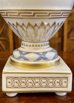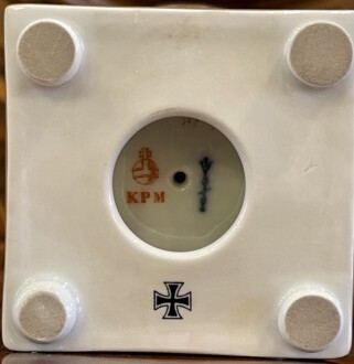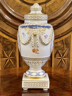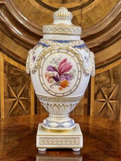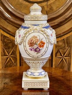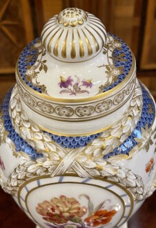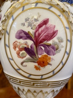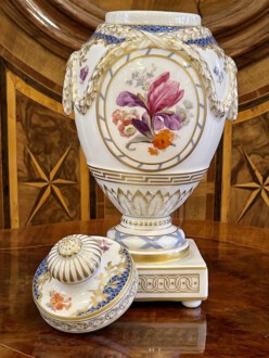 Deckelvase Breslauer Stadtschloss – KPM Berlin – Ovoider Korpus auf ansteigendem Fuß und festem quadratischem Sockel mit Kugelfüßchen – aufgelegte Girlanden, Relieffriese, ovale Medaillons bemahlt mit natürlichen bunten farbenfrohen Blumen – vergoldet antiquen Zieraten und feine blaue Schuppenornamentik – Höhe: 24,5 cm – unterglasurblaue Zeptermarke und roter Reichsapfel, Malermarke, Eisernes Kreuz ( 1914 – 1918 )