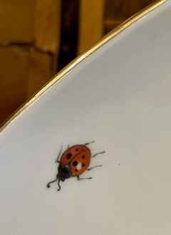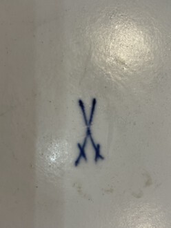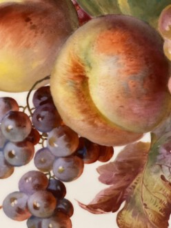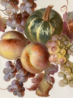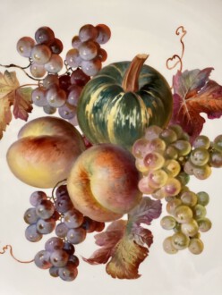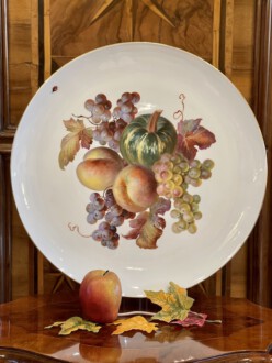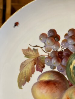 großer traumhafter Wandteller der Porzellanmanufaktur Meissen – wunderschön gemaltes Obstbukett, ein Insekt und Randvergoldung – Durchmesser: 42,5 cm – Meissen um 1940 – Formnummer: G 169 – Unterglasurblaue Schwertmarke Meissen, 2 Schleifstriche ( minimale kaum sichtbare Glasurfehler )