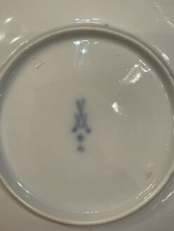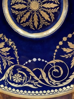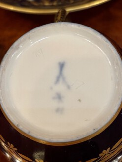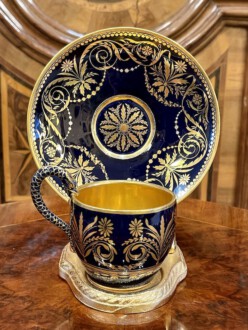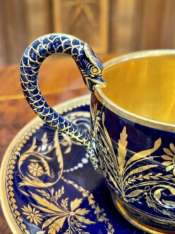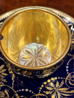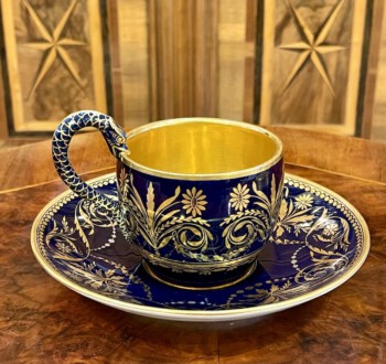 Tasse und Untertasse der Porzellanmanufaktur Meissen – schlichte Form mit ausgefallenen Henkel in Schlangenform – Untertasse und Tasse mit kobaldblauem Fond und üppiger Vergoldung von Palmetten und Girlanden  – Kugelgirlanden in Platin staffiert – Tasse innen Vollvergoldung, im Boden Palmetten – Tasse: Höhe mit Henkel 8 cm , Durchmesser 7 cm – Untertasse: Durchmesser 14,5 cm – Tasse und Untertasse mit gekreuzten Schwertern, unterglasurblau, fünfstrahliger Stern, der unter der Leitung von Graf Camille Marcolini (1774 – 1817) verwendet wurde