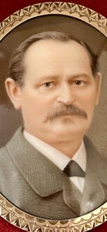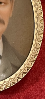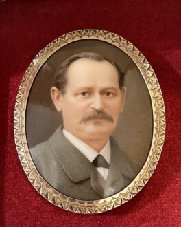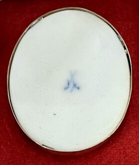 Meissener Miniaturplakette – Darstellung eines gut bürgerlichen Mannes – sehr feine Malerei – 14 Karat Goldeinfassung, fein ziseliert – Rückseitig blaue geknaufte Schwertermarke, Meissen um 1900 – Länge: 4,6 cm, Breite: 3,7 cm