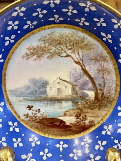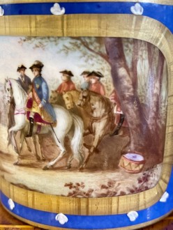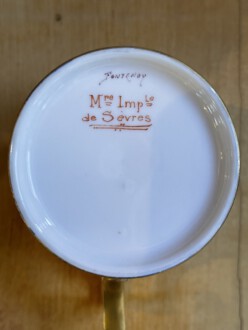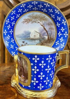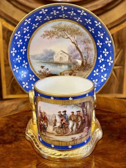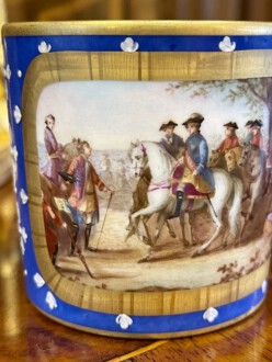 Tasse und Untertasse mit Batailleszene – zylindrische Tasse mit Henkel a‘ la grecque – königsblauer Fond, überdekoriert mit Kreuzblüten und Punkten in Weißemail – auf der Schauseite der Obertasse in goldradierter Rahmung feingemalte Szene der Schlacht bei Fontenoy 1745 – nach dem Gemälde von Horace Vernet von 1828 – Tassenboden bez. Fontenoy – auf der Untertasse Uferlandschaft mit Bauernhaus und Brücke – Se’vers um 1804/14 ( Bemalung nach 1828 ) – rote Manufakturmarke 1. Kaiserreich – Tasse: Höhe 6,5 cm, Durchmesser 6,5 cm – Untertasse Höhe 2,6 cm, Durchmesser 12,5 cm