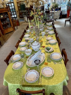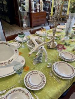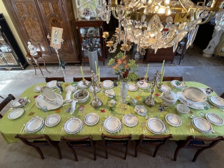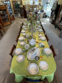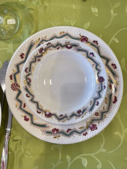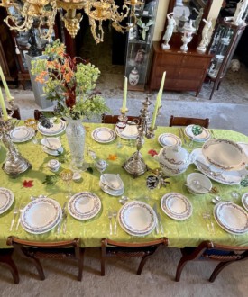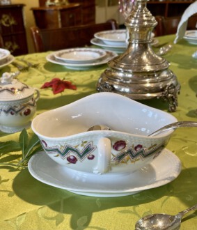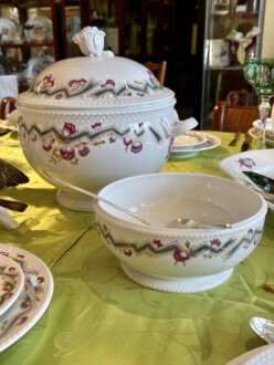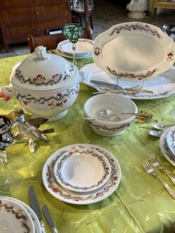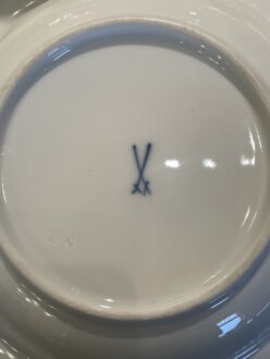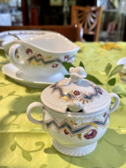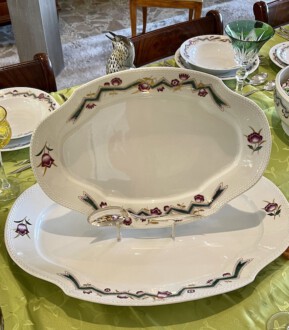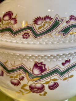 Speiseservice für sechs Personen, 28-teilig. Rand mit dreireihigem Schuppendekor im Relief, Deckelknäufe in Form plastischer Rosen. Umlaufend violett eingefasstes, grünes Zickzackband sowie violette Blüten, Goldgirlanden und -blätter. Bestehend aus: Je zwölf flachen und tiefen Speise-, Brot- und Desserttellern, runder Deckelterrine, zwei Saucieren, zwei Schüsseln, zwei Senfgefäße, zwei Salzieren, eine Stegschale, sowie vier oval vierpassiger Platten. Entwurf: Adelbert Niemeyer von 1920. Schwertermarke Meissen, 1934-1945, Terrine 1924-1934. 1. Wahl. Terrine H. 28 cm. Lit.: Karl Heinz Bröhan, „Sammlung Bröhan. Kunst der 20er und 30er Jahre“, 1985, Nr. 407, S. 418 Abb. Teekanne in Schwarzweiß