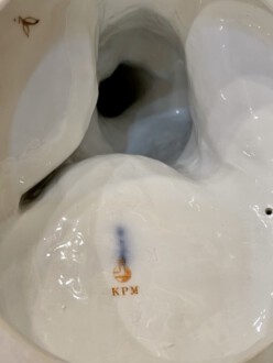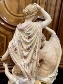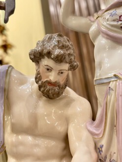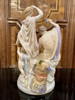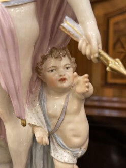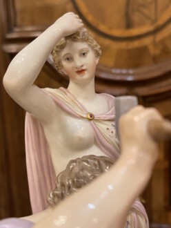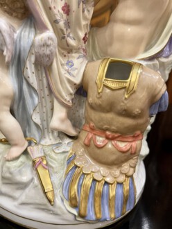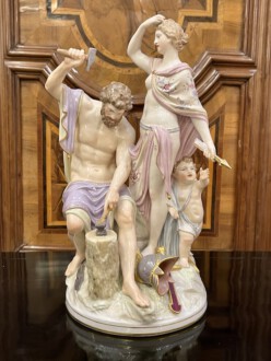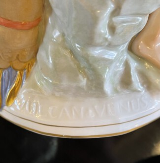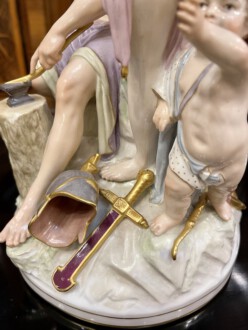 große mythologische Figurengruppe ,, Vulkan und Venus ,, der KPM Berlin – im Stil des Neurokoko – Modell: Bildhauer Louis Sußmann-Hellborn (* 20. März 1828 in Berlin; † 15. August 1908 ebenda), der von 1882 bis 1887 Leiter der Königlichen Porzellanmanufaktur in Berlin war – über einem runden Natursockel sitzender Vulkan, der gerade im Begriff ist einen Pfeil zu schmieden, daneben stehende Venus und hinter ihr ein Cupido – polychrom bemalt und goldstaffiert – Zeptermarke unterglasurblau, Reichsapfel aufglasurrot, Jahresbuchstabe R für 1917 – Höhe 35 cm, Breite ca. 22,5 cm