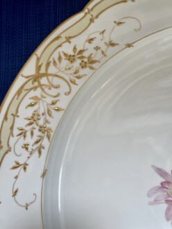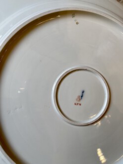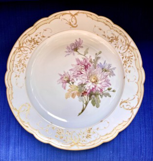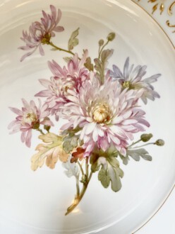 großer Teller Augusta-Form – Durchmesser: 40,5 cm – die Spiegeldarstellung zeigt gefüllte Astern an einem Zweig – zusätzlich wird das Blütenmotiv von zierlichen Reliefgoldornamenten veredelt – die vielfach gebogte Lippe wird von einem Goldrand betont und die Fahne schmückt ein reliefgoldgerahmtes schilfgrünes Fondband, das geschwungen zwischen sechs alternierend floralen und rankenförmigen Ornamentgefügen verläuft – Zepter in Unterglasurblau, Reichsapfel über KPM in Aufglasurrot – Jahreszeichen ,, N ,, mit drei Punkten für September 1913 – Malerzeichen ,, 50 ,, für Max Liebenau , Blumenmaler der KPM von 1894 bis 1931