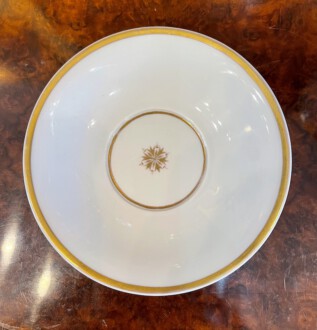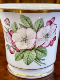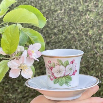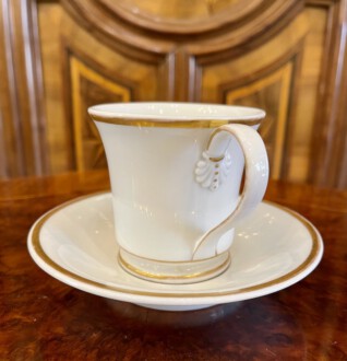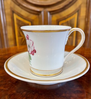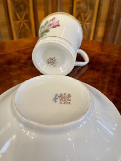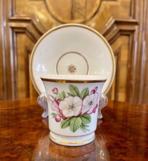 Tasse mit Untertasse – KPM Berlin – glockenförmige Tasse mit eingezogenem Stand, Campanerhenkel mit Muschelabschluss – schauseitig mit Apfelblüten dekoriert, polychrome Malerei – Unterglasurblaue Szeptermarke, braunrote Malereimarke Reichsadler ( 1823 – 1832) Preis: 340.- Euro