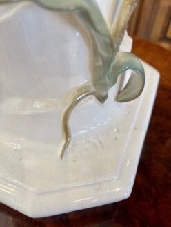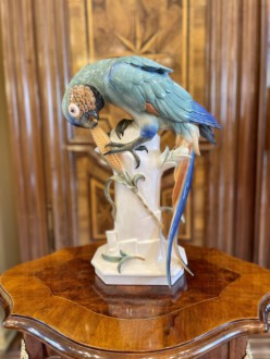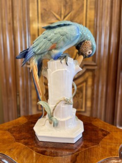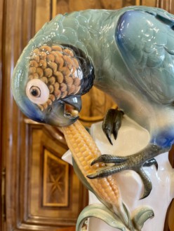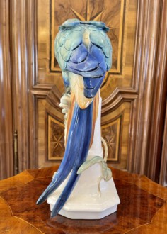 SCHWARZBURGER WERKSTÄTTEN Tierfigur – Entwurf: Arthur Storch (1870 – 1947), um 1930 – „Großer Papagei,“ an einem Maiskolben knabbernd, auf einem angedeuteten säulenförmigen Baumstumpf sitzend – naturalistisch, in kräftigen Farben unter Glasur staffiert – Höhe: 41cm – Monogrammiert mit Ritzmarke „A. St.“, Ritzmarke und Pressstempel mit „Schnürendem Fuchs“ – Modellnummer U1310