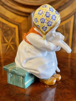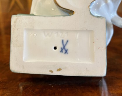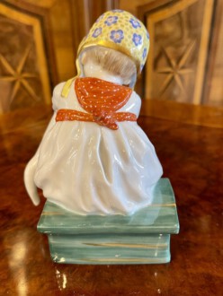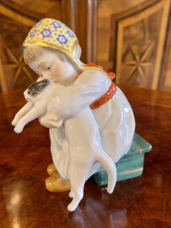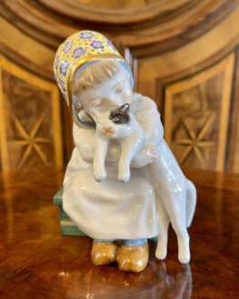 Meissenfigur ,, Kind mit Katze ,, Entwurf: Konrad Hentschel 1905 – auf einer Bank sitzendes Mädchen mit Haube, eine Katze im Arm haltend – Aufglasurbemalung – blaue Knaufschwerter, nach 1934, 1. Wahl, geritzte Modellnr. W121 – Höhe: 12 cm