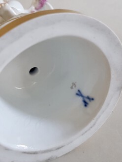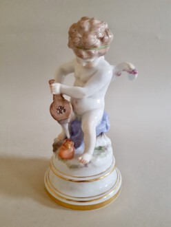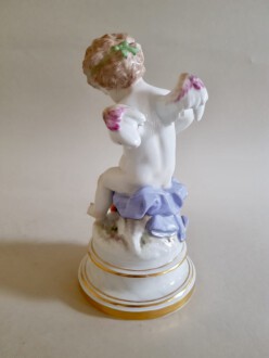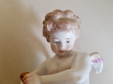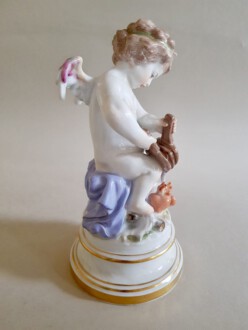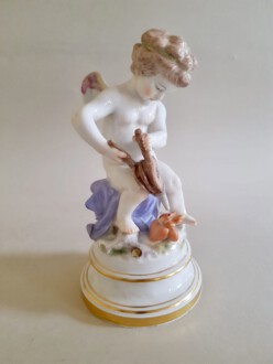 Meissenfigur – Amor, das Feuer zweier Herzen anfachend – farbig bemalt, gold staffiert – Entwurf: Heinrich Schwabe ( 1847 – 1924 ) – Ritzmarke, Pressmarke, Malermarke, blaue Schwertermarke – Modell-Nr.: L 108 – Modell-Jahr: 1877 – 1880 – Höhe: 18 cm – Meissen um 1900