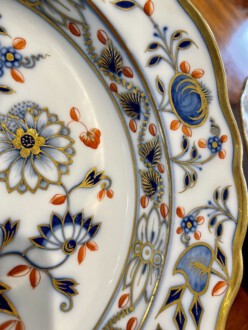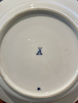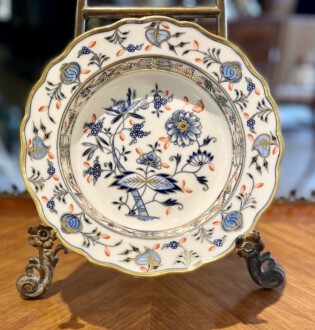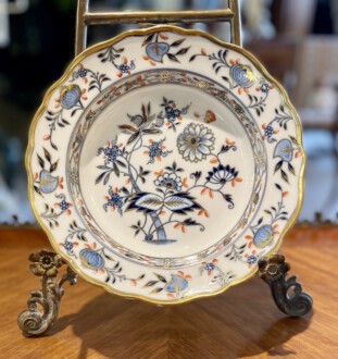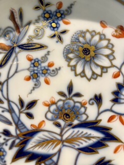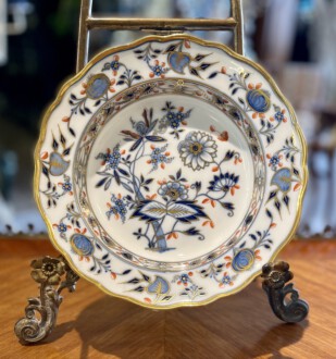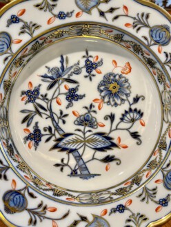 3 Suppenteller der Manufaktur Meissen – buntes Zwiebelmuster, Unterglasurblau, Aufglasur Gold und Koralle – Sog. Zwiebelmuster, seit 1730 nachweissbar, eines der bekanntesten Meissener indianischen Dekore. Der Name beruht indes auf einem Missverständnis: Melonen und Granatäpfel – damals in Meissen unbekannte Früchte, interpretierten die Maler als die Ihnen geläufige Zwiebel – Unterglasurblaue Schwertermarke, Knaufzeit 1860 – 1888 – Durchmesser: 23 cm