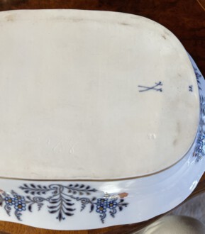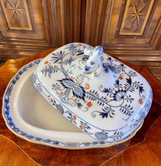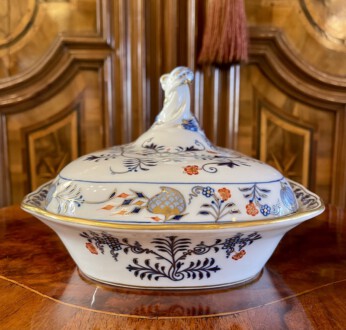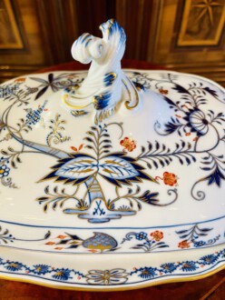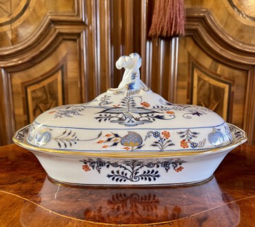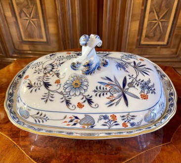Meissen Deckelterrine – sogenanntes buntes Zwiebelmuster, Unterglasurblau, Aufglasur Gold und Koralle – seit 1730 nachweissbar, eines der bekanntesten Meissener indianischen Dekore. Der Name beruht indes auf einem Missverständnis: Melonen und Granatäpfel – damals in Meissen unbekannte Früchte, interpretierten die Maler als die Ihnen geläufige Zwiebel – Unterglasurblaue Schwertermarke, Knaufzeit um 1900 – Länge: 28,5 cm, Breite: 22 cm, Höhe der Unterschale: 5 cm, Höhe mit Knauf: 17 cm