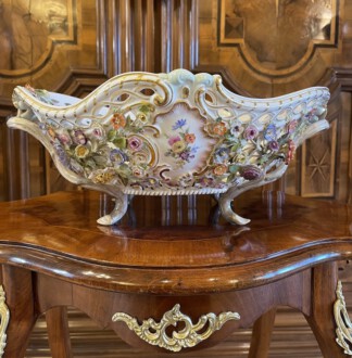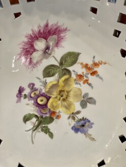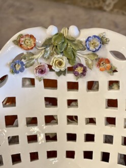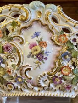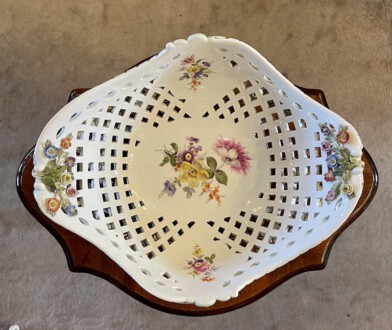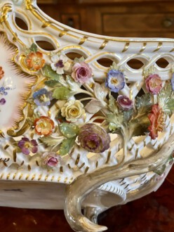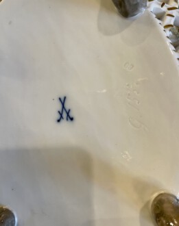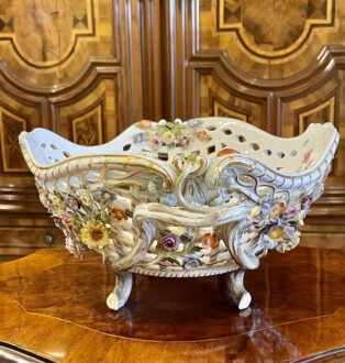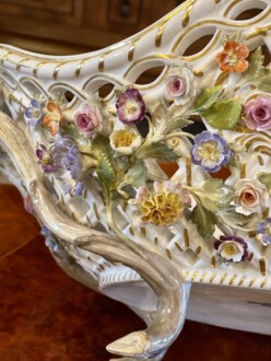 ovaler Korb auf vier grün staffierten Astfüßen aus denen seitlich zwei Henkel mit bunten Blumenzweigen wachsen – belegt mit plastisch dargestellten Blüten und Blättern – durchbrochen gearbeiteter Korpus – Henkel und Füße ineinander verschlungen – mittig bemalt mit einem schönem Blumenbukett – in der Mitte der Längsseiten zwei Rocailleschilder mit bunten Manierblumen – an den Griffseiten innen aufgesetzte plastische Blüten und Blätter – Unterglasurblaue Schwertermarke, Meissen I. Wahl, Knaufschwerter ca. 1880 – Länge: 41 cm, Breite: 33 cm, Höhe: 16,5 cm