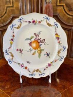 6 Speiseteller der Porzellanmanufaktur Meissen – im Spiegel Obst- und Gemüsemalerei – der Rand ist mit einer Blütengirlande verziert, abwechselnd polychrom und goldradiert, mit blauen Schleifen verbunden – Durchmesser 23,5 cm – Herstellungsperiode 1763 – 1774