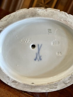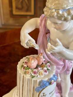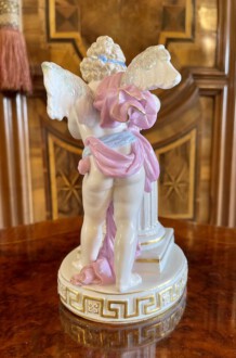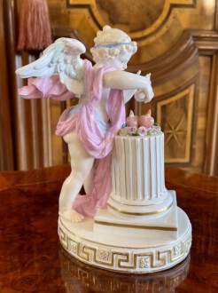 Figur ,, Amor ,, der Porzellanmanufaktur Meissen – französische Aufschrift auf der Säule „Ich habe sie beruhigt“ – Modell: Michel Victor Acier – Modell-Jahr: 1779 – Modellnummer: G 29 – blaue gekaufte Schwertermarke um 1900 – Höhe: 20 cm