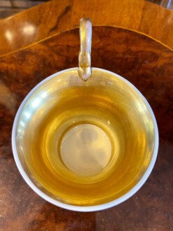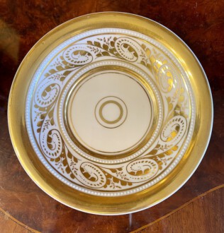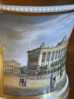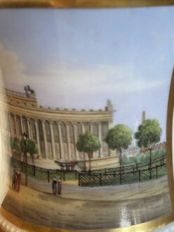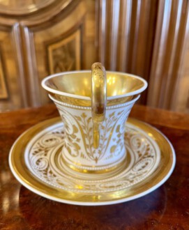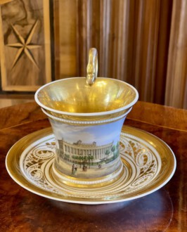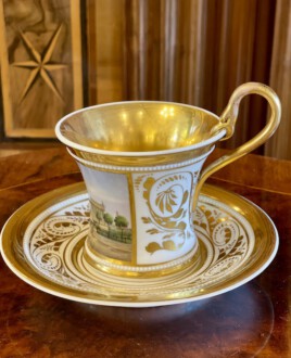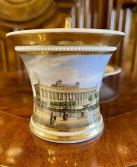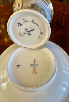zylindrische Tasse – Perlenfriesform mit ausschwingendem Lippenrand und Schwanenhenkel – schauseitig eine große goldgerahmte Kartusche mit feiner polychromer Lupenmalerei – unter dem Boden bezeichnet Ansicht ”Das Museum in Berlin” – Innenvergoldung – rückseitig floral bemalt – passende Untertasse – blaue Zeptermarke, Reichsapfel – Malersignet – KPM um 1835 – Höhe zusammen 11,5 cm
