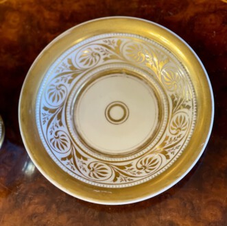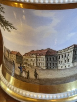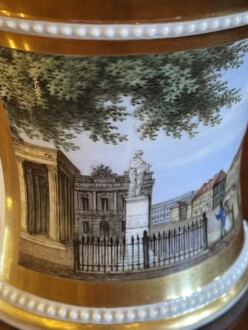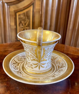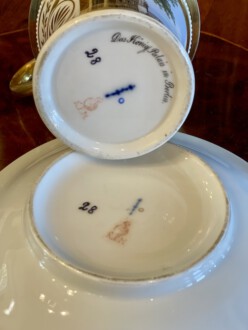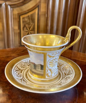 zylindrische Tasse – Perlenfriesform mit ausschwingendem Lippenrand und Schwanenhenkel – schauseitig eine große goldgerahmte Kartusche mit feiner polychromer Lupenmalerei – unter dem Boden bezeichnet Ansicht ”Das Königl. Palais in Berlin” – Innenvergoldung – rückseitig floral bemalt – passende Untertasse – blaue Zeptermarke, Reichsapfel – Malersignet – KPM um 1835 – Höhe zusammen 11,5 cm