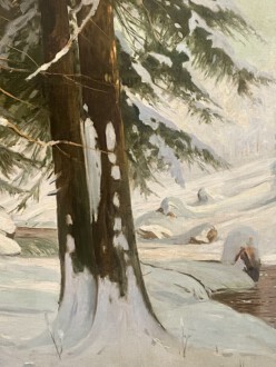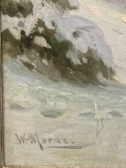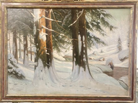 Sonnendurchfluteter Winterwald bei einem Bachlauf – Öl auf Leinwand, doubliert – 71 cm x 101 cm – unten links signiert „W. Moras“ – Walter Otto Moras ( geb. 20. Januar 1856 in Berlin; † 6. März 1925 in Harzburg) – bekannt für seine Spreewaldmotive und seine Waldlandschaften, zu verschiedenen Tages- und Jahreszeiten