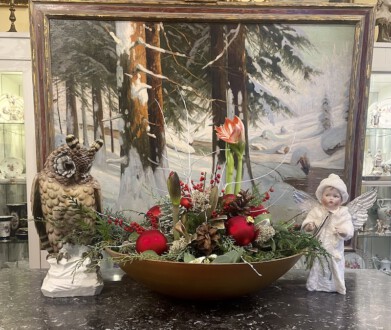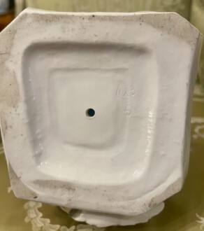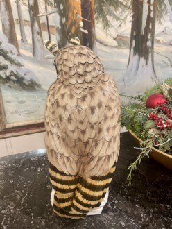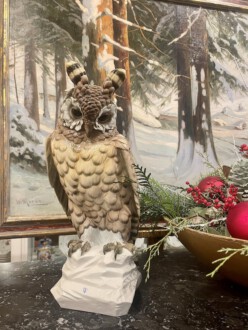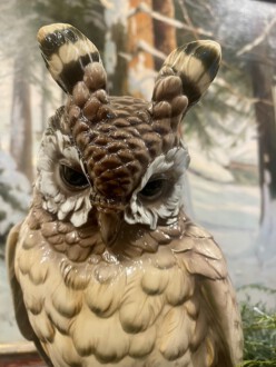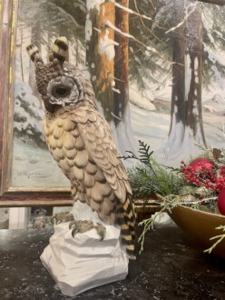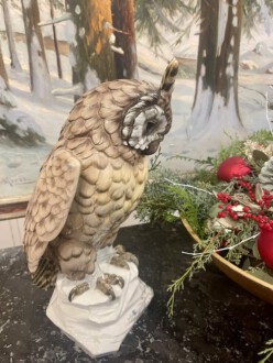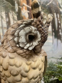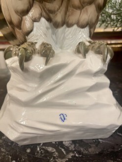 Uhu auf Felssockel sitzend – Weißporzellan, Unterglasurbemalung in Brauntönen und Weiß – Entwurf: August Göring 1927 – Höhe : 43 cm – Unterglasurblau gehöhter Blindstempel schauseitig – Bodenunterseite Blindstempel und Modell-Nr. 623. Nummer ´49` auf dem Sockel, seitlich