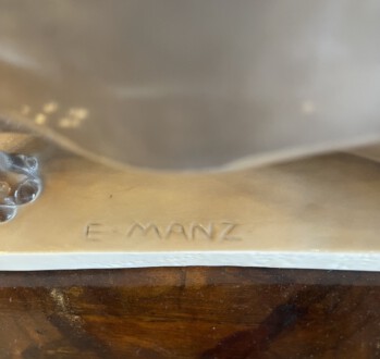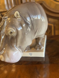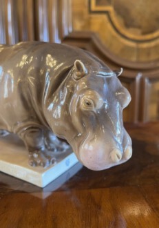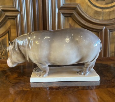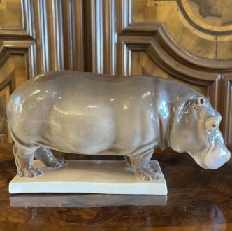 Nilpferd ,, Mathilda ,, – auf rechteckiger Plinthe stehendes Nilpferd – naturalistische Ausführung – Unterglasurmalerei in Braun- und dezenten Rose’tönen – Entwurf: Emil Manz – Höhe: 12 cm, Breite: 24 cm, Tiefe: 8 cm – Manufakturmarke Nymphenburg 1.Hälfte 20. Jh.