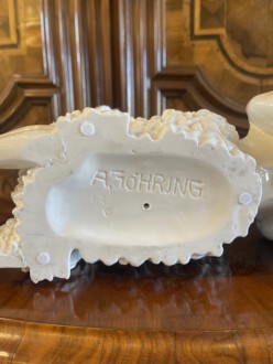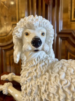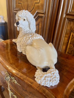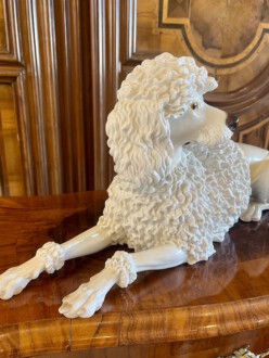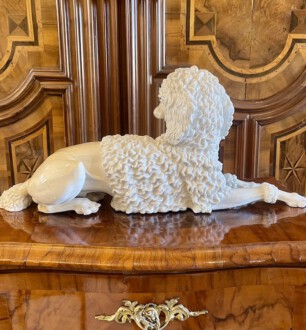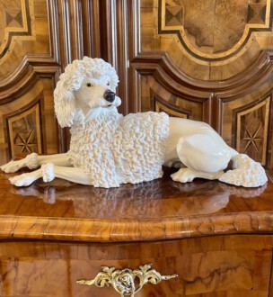 liegender Königspudel, den Kopf zur Seite wendend – dezente farbige Bemalung – Königliche Porzellanmanufaktur Nymphenburg 1920/1930, gepresstes Rautenschild – Modell: August Göhring, unterseitig Künstlersignatur – Modellnummer: 575 – Länge 50 cm, Höhe: 22 cm